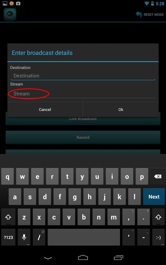 Step 7. Then use the “Task Manager” button again to switch back to the “Broadcaster for Android” application and paste the “FMS Stream Name” into the “Stream” text box. Now you can click the OK button.